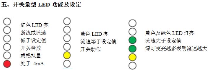 將流開關裝好,使介質以需要監(jiān)測的流速流動,擰開面板上的螺絲,調整電位計, 使第一個綠色LED怡好變亮。此后當流速低于當前值時,開關就釋放(紅燈亮)。若要使開關點比當前流速小,可調整電位計(順時針旋轉螺絲刀)使綠色 LED多亮一些。